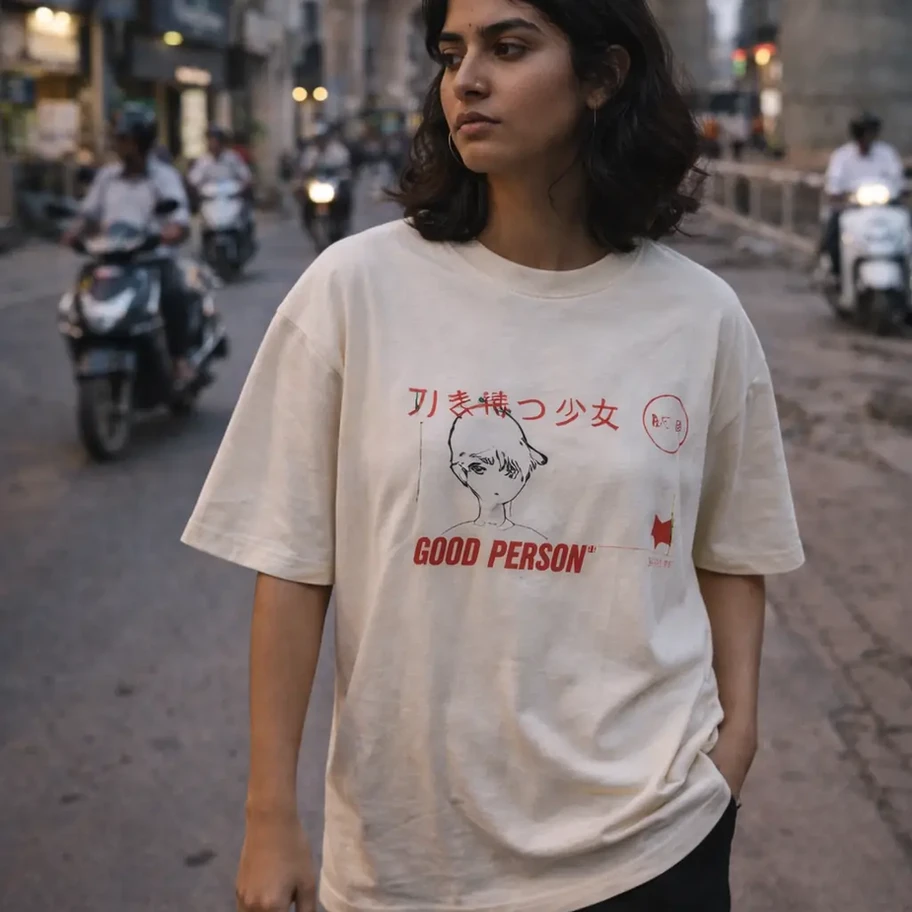 The Good Person Tee plays with the idea of identity as performance — where labels, symbols, and statements blur the line between who we are and who we appear to be.